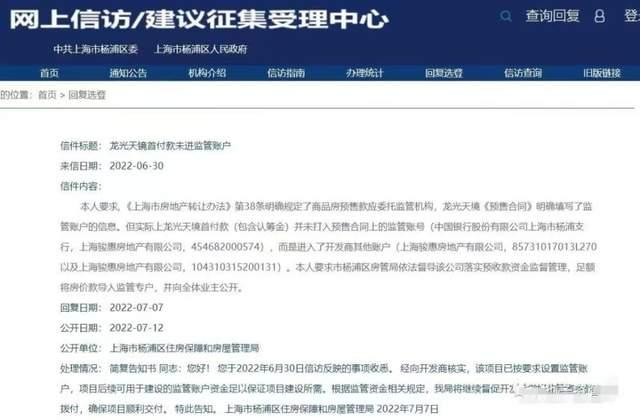 近日,据媒体报道,根据上海市杨浦区住房保障和房屋管理局在市政府网站上刊登的来信回复,龙光集团开发的龙光天境项目,没有将订金和首付款打入预售监管账户。