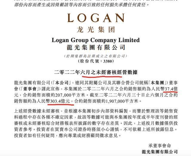 7月8日,龙光集团发布销售业绩公告,公司于2022年6月实现合约销售额约人民币37.4亿元。今年上半年,公司累计合约销售额约人民币303.4亿元,同比下降58.8%;合约销售面积约190.7万平方米,同比下降51.16%。