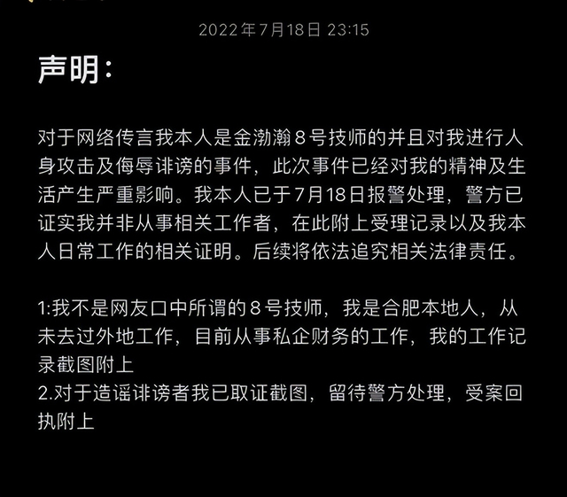 7月19日,当事人回应称,自己是合肥本地人,目前从事私企财务工作,网络侮辱诽谤已对自己精神和生活造成严重影响,目前已搜集证据报警,警方已受案,正在调查处理中。