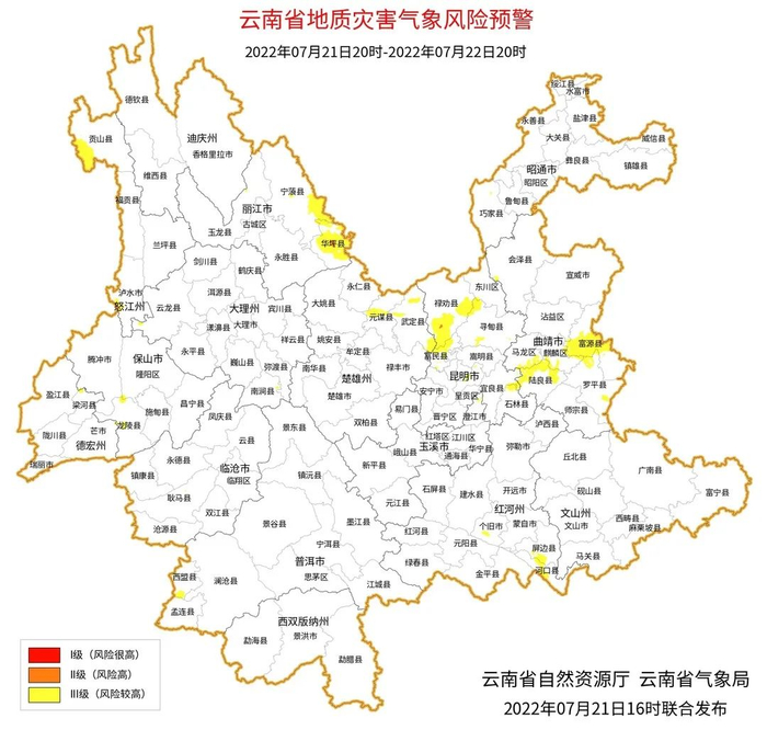 气象部门预计,2022年07月21日20:00~07月22日20:00,曲靖市东部,丽江市东南部,楚雄州北部,昆明市西北部局部区域发生滑坡泥石流的风险高;曲靖市东部、南部,丽江市东北部,大理州东南部,怒江州西北部、南部,德宏州北部、东部,普洱市西南部,红河州中部、东南部,楚雄州北部、东北部,昆明市北部、中部、东南部局部区域发生滑坡泥石流的风险较高。