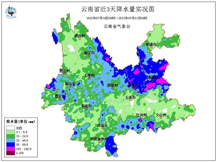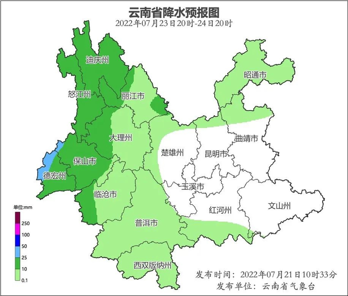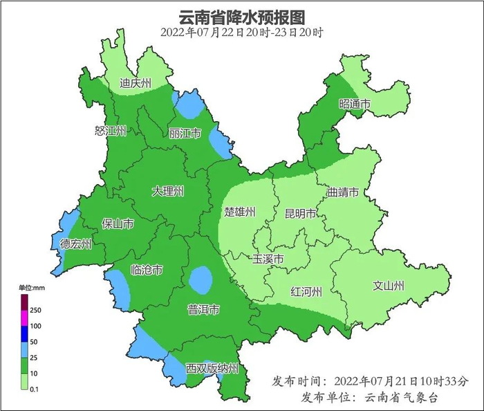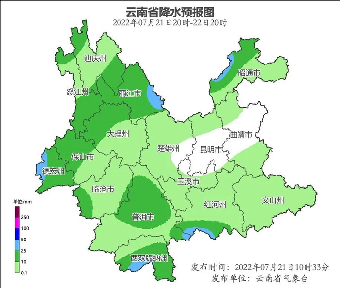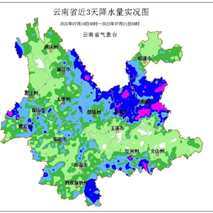 7月22日,昭通、迪庆、怒江、丽江、大理北部、保山、德宏、临沧西部、普洱、西双版纳、红河南部有小到中雨局部大雨。滇中北部、滇西、滇西南有雷暴、局地短时强降水和冰雹等强对流天气。