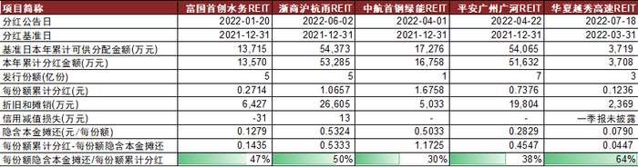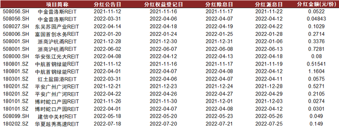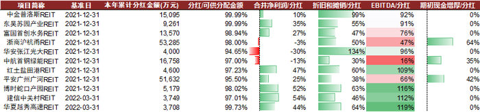 注:建信中关村REIT和华夏越秀高速REIT的本年累计分红金额由分红公告的金额按天数比例去除2021年12月各自基金合同生效日至2021年12月31日的部分得到。