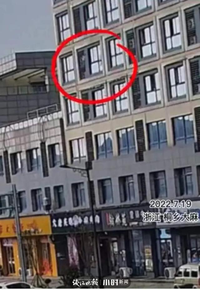 沈东是浙江桐乡民泰村镇银行行长助理,单位就在桐乡大麻镇光明路上。7月19日上午10点13分,沈东刚从外面回来,停好车之后,发现对面小区楼上,突然有个东西掉了下来,重重砸到了二楼广告牌上,同时还伴有“砰”的一声巨响。