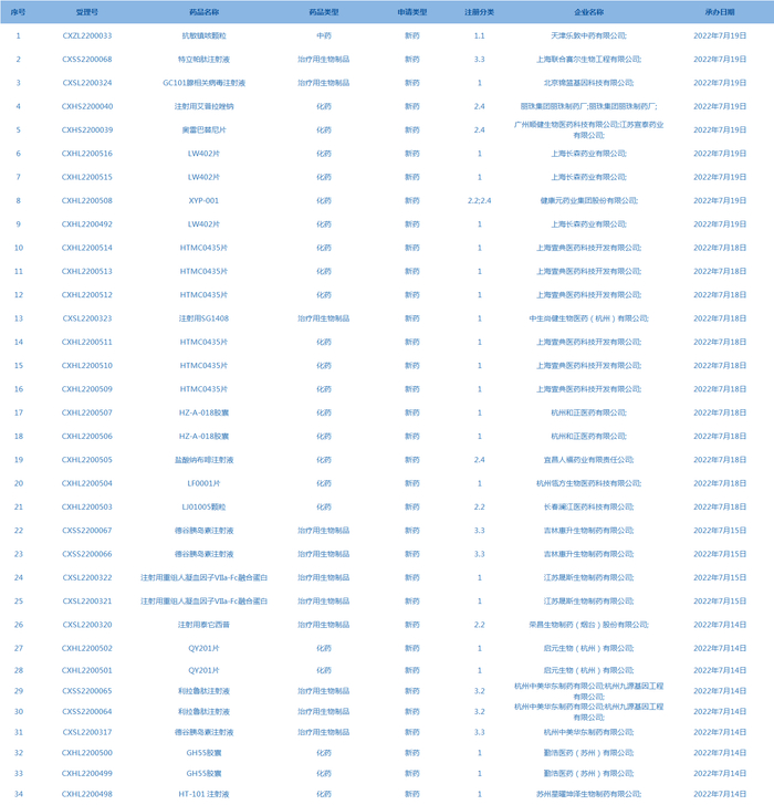 3.CDE承办受理34个新药上市申请,包括抗敏镇咳颗粒等药品。(截至7月19日)