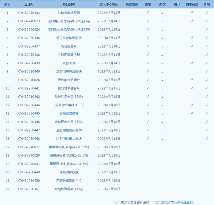 2.CDE网站公示22个仿制药一致性评价任务,涉及盐酸舍曲林胶囊等药品。(截至7月19日)