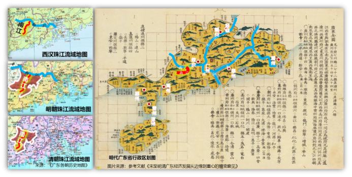 海陆丝路、由水而兴。古时,交通多依靠水道,受羚羊峡天险的影响,从当时岭南的政治文化中心广信(今封开)出海,最便捷的方式就是从广信渡过西江,沿南江一直向南,在罗镜、太平跨过分水岭后分别沿鉴江、漠阳江南下出海。南江打通了肇庆封开的古广信到南海的通道,即海陆两条丝绸之路的对接通道,成为了中原汉人南迁岭南、雷州半岛乃至海南岛的一条交通要道,而罗定也因此成为粤西与南路沿海各县货物运输中心,南北宾客络绎不绝,经济繁荣昌盛。历朝历代均在此建州制县,使之成为岭南州县建制最多之地。