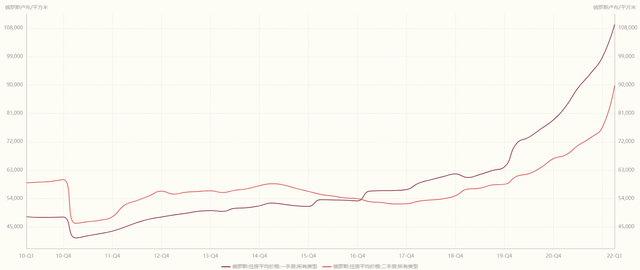 从今年一季度的平均房价(俄罗斯卢布计价)来看,俄罗斯一手住房比去年同期上涨了31.28%,二手住房同比大约上涨了32.5%。