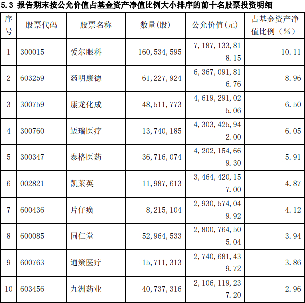 虽然调入调出的变化仅有两只,但其他部分个股的持股数也有发生变化。比如爱尔眼科、药明康德、康龙化成、迈瑞医疗、片仔癀的持股数都有所增加。