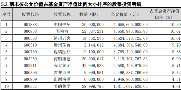 其他个股方面,海康威视退出前十大,中国中免、迈瑞医疗的持股数有小幅下降。
