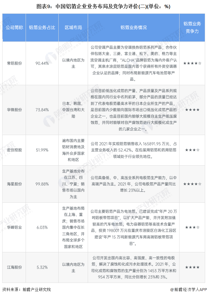 铝箔行业上市公司中,鼎胜新材、东阳光在业务布局上更为全面,铝箔业务竞争力较强;海星股份、常铝股份的铝箔业务占比超过90%;华峰股份、鼎胜新材的铝箔业务国际竞争力较强。