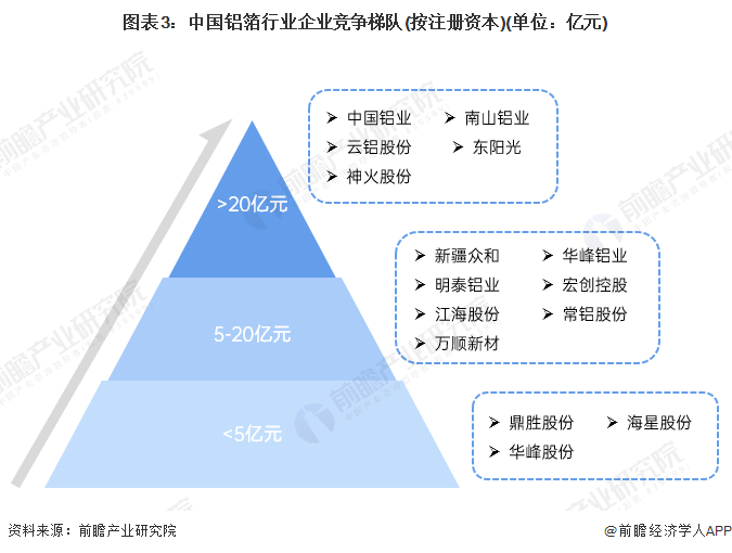 铝箔生产企业依据注册资本划分,可分为3个竞争梯队。其中,注册资本超过20亿元的企业有:中国铝业、南山铝业、云铝股份、东阳光、神火股份;注册资本在5-20亿元之间的企业有:新疆众和、华峰铝业、明泰铝业、宏创股份、江海股份、常铝股份、万顺新材;鼎胜新材、海星股份、华峰股份的注册资本在5亿元以下。