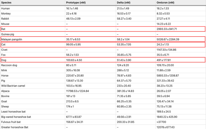 上表为不同动物对德尔塔毒株和奥密克戎毒株的亲和力对比,其中可以看出小鼠的亲和力发生了巨大的变化,同时狗的亲和力也出现了上升,这给家养狗、仓鼠等宠物的读者们提了一个醒,你们之间可能会存在交叉传播(图源:Cell Discovery)