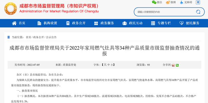 中国质量新闻网讯 2022年7月5日,成都市市场监督管理局网站通报2022年家用燃气灶具等34种产品质量市级监督抽查情况。