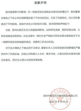 “面对疫情等不利影响,在一季度没有完成既定业绩目标的情况下,我司董事长情急之下在公司内部群里发表了不恰当的言论。”致歉声明显示,“对于此次情急之下做出的不当举动,董事长本人已经深刻意识到事情的严重性并作了自我反省。”