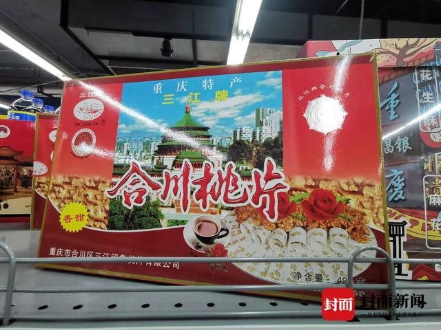 那么,贴牌的“三江牌”桃片在销售端表现如何呢?在合川重百超市,封面新闻记者看到,货架上涉及合川桃片的品牌很多,其中“三江牌”桃片所占比例并不大,仅出售一种香甜味的礼盒装。