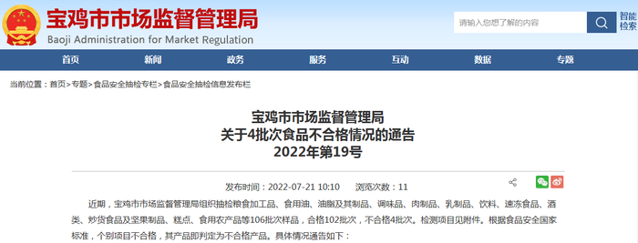 陕西省宝鸡市市场监管局关于4批次食品不合格情况的通告 2022年第19号