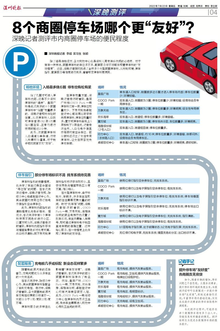 除了追寻诗和远方,各大购物中心也是深圳人周末娱乐休闲的必选项。对于有车一族来说,商圈停车场的车位多不多,配套服务好不好都体现着停车场的“友好程度”。近日,深晚记者随机挑选了全市多个大型商圈停车场,从场地环境、停车指引、配套服务等维度进行测评,看看哪家停车场更便民。
