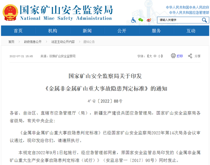 本规定自2022年9月1日起施行。经应急管理部同意,原国家安全监管总局印发的《金属非金属矿山重大生产安全事故隐患判定标准(试行)》(安监总管一〔2017〕98号)同时废止。