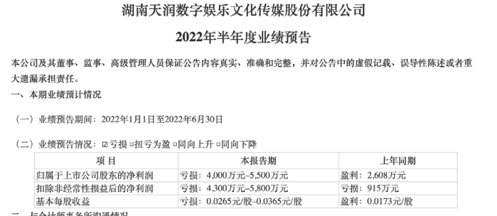 7月15日,ST天润发布了2022年半年度业绩预告,其今年上半年归属于上市公司股东的净利润为亏损4000万元–5500万元,上年同期盈利2608万元,较2021年同期大幅下滑。