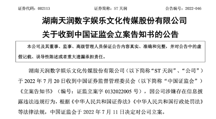 7月21日晚间,ST天润公告称,公司于7月20日收到证监会《立案告知书》,因公司涉嫌存在信息披露违法违规行为,证监会于7月11日决定对公司立案。