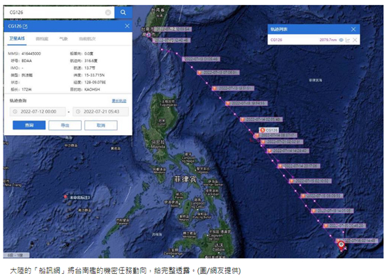 台湾“信传媒”21日称,“台南舰”在出港后,关掉自动识别系统(AIS),查询国际多家知名舶航迹网站,包括Vessel Tracker、Vessel Finder、Ship Finder等,相关海上移动通信业务标识码查询系统,都查询不到“台南舰”12日深夜后的航迹。