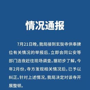 江苏省南京市民族宗教事务局官方微博7月22日消息,关于玄奘寺供奉牌位有关情况,玄武区民族宗教事务局通报称,据初步了解,今年2月,寺方发现相关情况后,已予以纠正。针对上述情况,该局决定对该寺开展整顿。