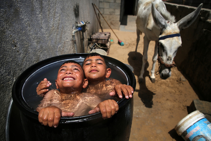 当地时间2022年7月21日,加沙地区,当地迎来高温天气,孩童们在户外冲凉解暑。