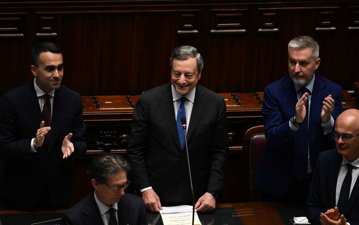 当地时间2022年7月21日,在意大利罗马,意大利总理马里奥·德拉吉(中)抵达众议院。据意大利总统府网站消息,意大利总理马里奥·德拉吉21日向总统塞尔焦·马塔雷拉递交辞呈。马塔雷拉接受辞呈,并要求德拉吉作为看守内阁总理继续处理当前政务。当地时间21日下午,意大利总统马塔雷拉与意大利总理德拉吉在总统府共同签署法令,决定解散议会。