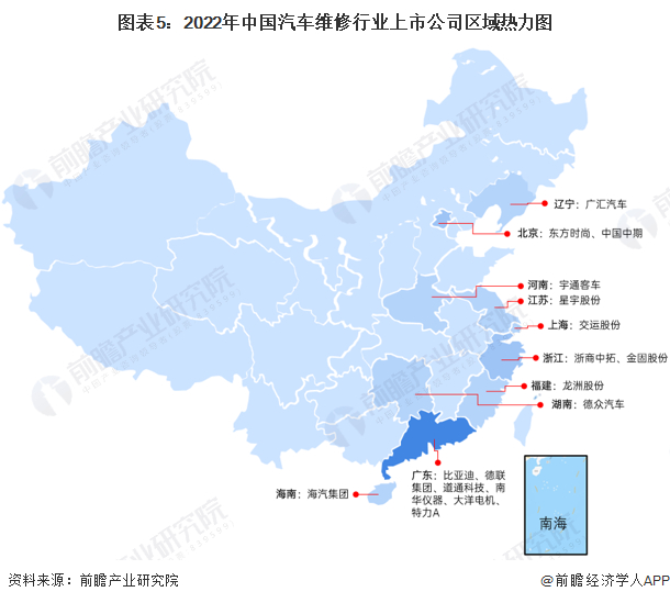 从上市企业的分布来看,我国东部及南部沿海地区汽车维修行业上市企业分布的数量较多。