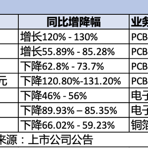 据财联社记者梳理,涉足电子级玻纤布、铜箔、覆铜板制造等上游环节的宏和科技(603256.SH)、金安国纪(002636.SZ)、超华科技(002288.SZ)上半年业绩均出现下滑,归母净利方面同比降幅最高逾八成;中游盈利能力分化明显,龙头鹏鼎控股(002938.SZ)预计上半年归母净利13.93亿元-14.57亿元,同比增120%-130%,在一众厂商中脱颖而出,此外除世运电路(603920.SH),多数PCB制造厂商业绩承压,甚至出现亏损。