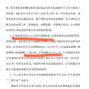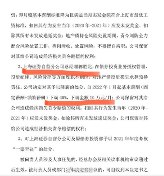 该《问责决定书》显示,截止2022年4月末,原上海自营分公司债券投资部预计亏损约6.75亿元。因亏损严重,对原债券投资部总经理刘防和总经理郭胜北作出处罚。对刘防予以降级、降职处分、取消奖金等处罚;对郭胜北予以基本薪酬下调40%、扣除奖金等处罚;对上海证券自营分公司及原债券投资部予以2021年年度老核“一票否决”的处分。