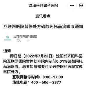 同日,界面新闻记者以患者身份向沈阳兴齐眼科医院微信公众号询问。通过该院微信公众号,客服人员介绍称,其接到的通知是即日起互联网医院暂停硫酸阿托品;兴齐眼科互联网医院从今年7月22日起不再开具院内制剂0.01%硫酸阿托品滴眼液;如有需要可至兴齐眼科医院实体医院。