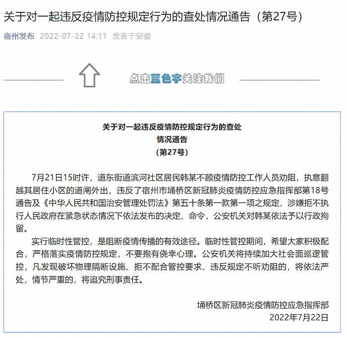“宿州发布”微信公众号7月22日消息,埇桥区新冠肺炎疫情防控应急指挥部通告,7月21日15时许,道东街道滨河社区居民韩某不顾疫情防控工作人员劝阻,执意翻越其居住小区的道闸外出,违反了宿州市埇桥区新冠肺炎疫情防控应急指挥部第18号通告及《中华人民共和国治安管理处罚法》第五十条第一款第一项之规定,涉嫌拒不执行人民政府在紧急状态情况下依法发布的决定、命令,公安机关对韩某依法予以行政拘留。