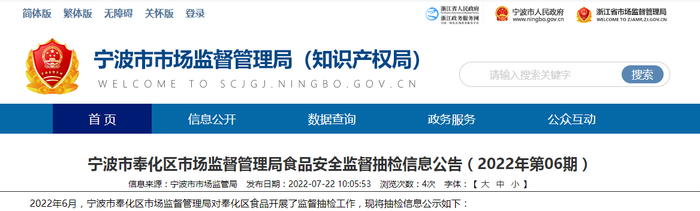 中国质量新闻网讯 7月22日,宁波市市场监管局网站发布一条食品抽检信息,涉及宁波市奉化区市场监督管理局食品安全监督抽检信息公告(2022年第06期)。