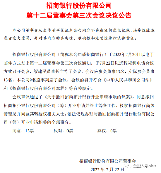 7月22日讯,招商银行公告称,该行董事会会议审议通过了《关于撤回招商拓扑银行开业申请事项的议案》,同意撤回招商拓扑银行股份有限公司(筹)开业申请并终止筹备工作。