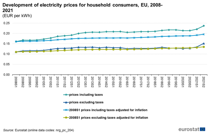 俄乌冲突之后,欧洲各国电费飙升。如今,欧洲多国都面临生活成本危机,30%的家庭甚至因无力支付而开始拖欠水电费。以德国为例,2021年德国1度电的价格在0.30欧元左右(约合人民币2元),2022年初已涨到0.35欧元(约合人民币2.4元),2022年7月份更是飙升至0.44欧元(约合人民币3元)。相较我国居民电价长期维持在0.5元左右,欧洲用电之贵,可见一斑。