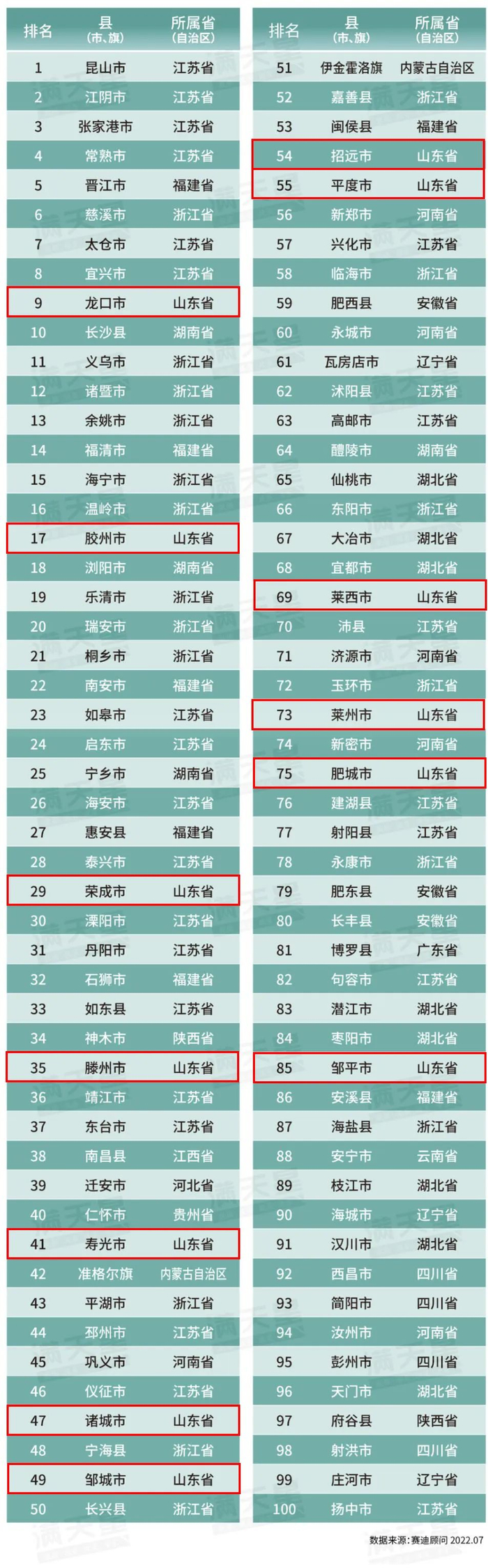 与赛迪顾问2021年发布的榜单相比,山东入围的这13个县市与去年相同,不过名次上有些县市略有变化。报告显示,昆山、江阴、张家港、常熟、晋江、慈溪、太仓、宜兴、龙口、长沙排前十名。龙口市是山东唯一一个入围前十名的县市,与2021年相比,排位前进了一名,从第10名升至第9名。