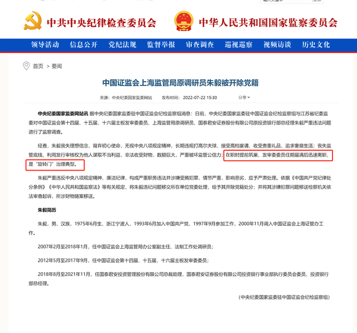 在中纪委于7月22日发布的有关朱毅开除党籍的公告中,明确提出朱毅“在职时提前筑巢,发审委委员任期届满后迅速离职”的行为,是“旋转门”治理典型。