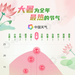 “南州大暑何可当,雪冰不解三伏凉”。大暑正好处于“中伏”前后时期,为一年中最热的时段,此时节最真切的感受就是热。中国天气网通过盘点1991年至2020年气象大数据发现,大暑节气的平均气温在二十四节气中最高,平均高温日数也是最多的。