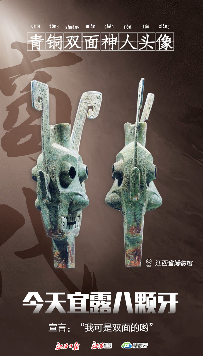 与四川三星堆出土的大量凸睛青铜神面具对照,新干的神人铜头像有明显不同之处:它并非可以佩戴的面具,而是双面造型。不少学者认为,这件头像是王权的象征。青铜时代王的权威是全方位的,天圆地方的造型代表这是上天赋予的神性。头像的双面造型,则表示视界由180度转为360度,突破了人的视野局限,这象征着上天赋予人以神性的观察力,俗世中什么都逃不过王的眼睛,代表“法力无边”。1989年出土于江西省新干县大洋洲,现藏于江西省博物馆。