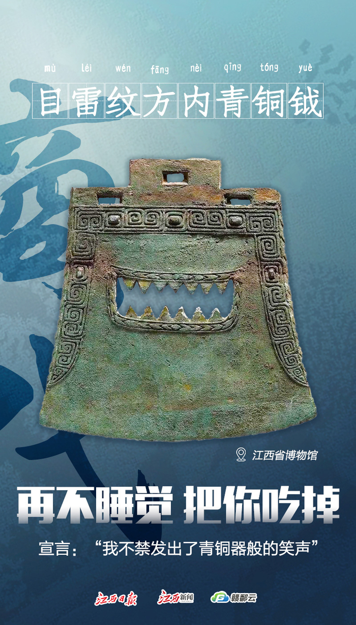 商目雷纹方内青铜钺身较宽,刃微弧,刃宽于肩,方内短窄,上有一长方形穿,肩部有两长方形穿。钺体中部开一马鞍形镂孔,形近张形略翘的大嘴,露出上下2排13颗三角形利齿,环饰一周燕尾纹。肩下及周边均饰目雷纹带,纹中宽凹线中有嵌饰红铜的痕迹。此钺形体巨大,颇具王者之气。1989年出土于江西新干大洋洲,现藏于江西省博物馆。