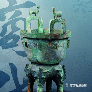 这件四足铜甗,重达78.5千克,体形巨大,气势雄浑,为迄今所见青铜甗中最大者,有“甗王”之誉。铸造工艺方面,除了耳上双鹿,整个器物一次浑铸成型。四足铜甗在商代较为少见。甗上出现了殷墟时期流行的斜角雷纹、上卷尾连体兽面纹、牛角兽面纹等纹饰,耳上加铸立鹿的特点则与新干方鼎、扁足鼎加铸动物造型的风格一致。可以推断,这件器物铸造于商代晚期,体现了当地人对中原青铜器的本土改造。1989年出土于新干县大洋洲遗存,现藏于江西省博物馆。