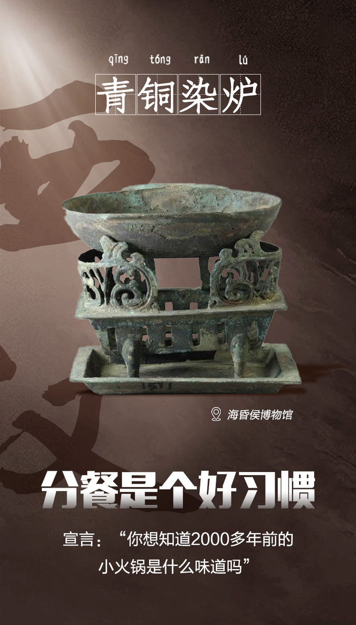 镂空方形鼎式青铜染炉构造可分为三个部分,主体为镂空炭炉,下部为方形托盘,炉上置一可活动的耳杯。其形制多小巧,是炊器与盛食器的组合之器,耳杯盛食,炉身置炭,浅盘承灰。当炭火温热耳杯中调料后,可将肉食染味食用。染炉的设计符合汉代人分餐而食之制,宴饮时一人一套,随吃随“染”。出土于海昏侯墓中,现藏于海昏侯博物馆。