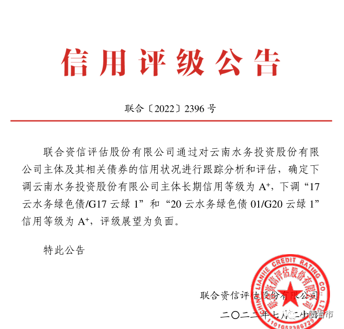 7月20日,联合资信公告称,将云南水务(06839.HK)主体长期信用等级下调为 A+,并下调“17云水务绿色债/G17 云绿 1”和“20云水务绿色债 01/G20 云绿 1”信用等级为A+,评级展望为负面。