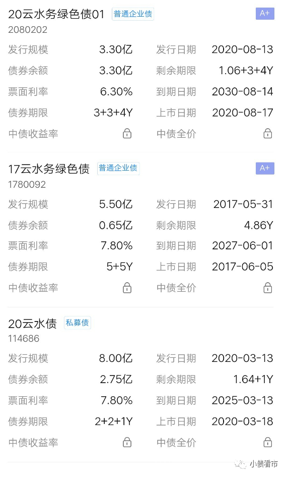 《小债看市》统计,目前云南水务存续债券3只,存续规模6.7亿元,其中一年内到期规模有2.75亿元。