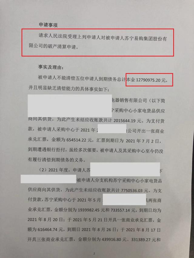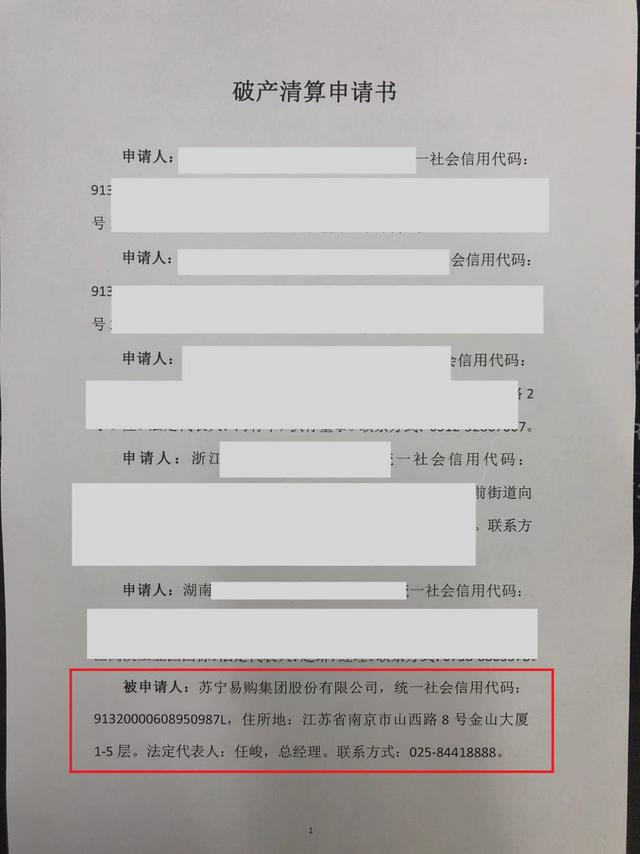 因未能清偿千万到期债务,苏宁易购再被5家供应商申请破产清算!