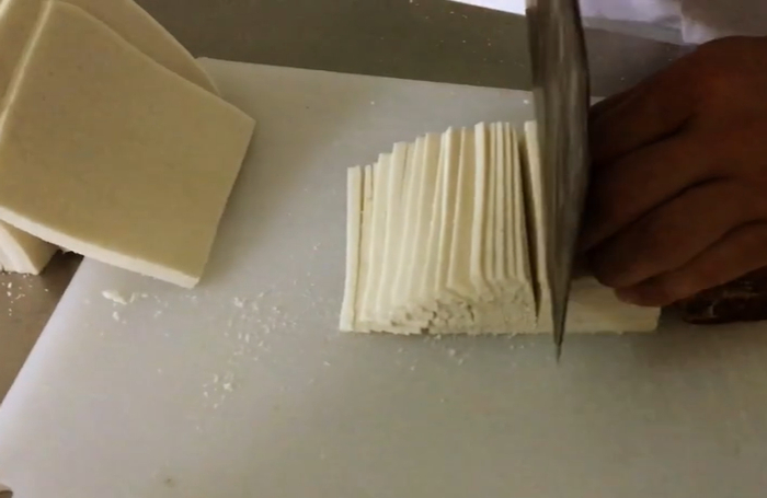 冷却成型的米豆腐比普通豆腐更加爽滑细腻。为了避免粘刀,可以用棉线将其切为块状、条状,再根据自己的喜好进行烹饪,较为家常的做法是和肉末、辣椒、葱姜蒜等一起炒制。
