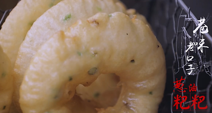 将粳米浸泡6~8个小时后,沥干、磨粉,掺入少量剩米饭,再加水、切碎的小葱和食盐等调味品搅拌均匀。之后静置30分钟,让米糊充分发酵,然后就可以下锅了。炸制葱油粑粑讲究油热火小,油到六七成热时,用圆形、中部有铁棍的模具舀一勺米糊伸入油锅中,等米糊在模具中定型后翻面,炸至两面金黄就可以出锅了。