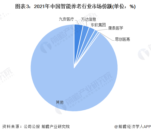 2021年,智能养老行业市场份额排名靠前的是九安医疗、万达信息和康泰医学。整体来看,排名前五的企业所占市场份额不高,主要由于智能养老行业设计的产品及服务种类较多,导致市场较为分散。