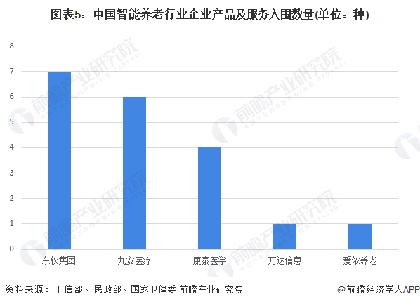 根据工信部、民政部、国家卫生健康委员会三部门联合发布的《智慧健康养老产品及服务推广目录(2020年版)》统计,入围产品种类最多的上市企业是东软集团,共有7种智能养老产品及服务入围名单,其次是九安医疗,共有6种智能养老产品及服务入围,康泰医学入围4种智能养老产品,暂无相关服务入围。